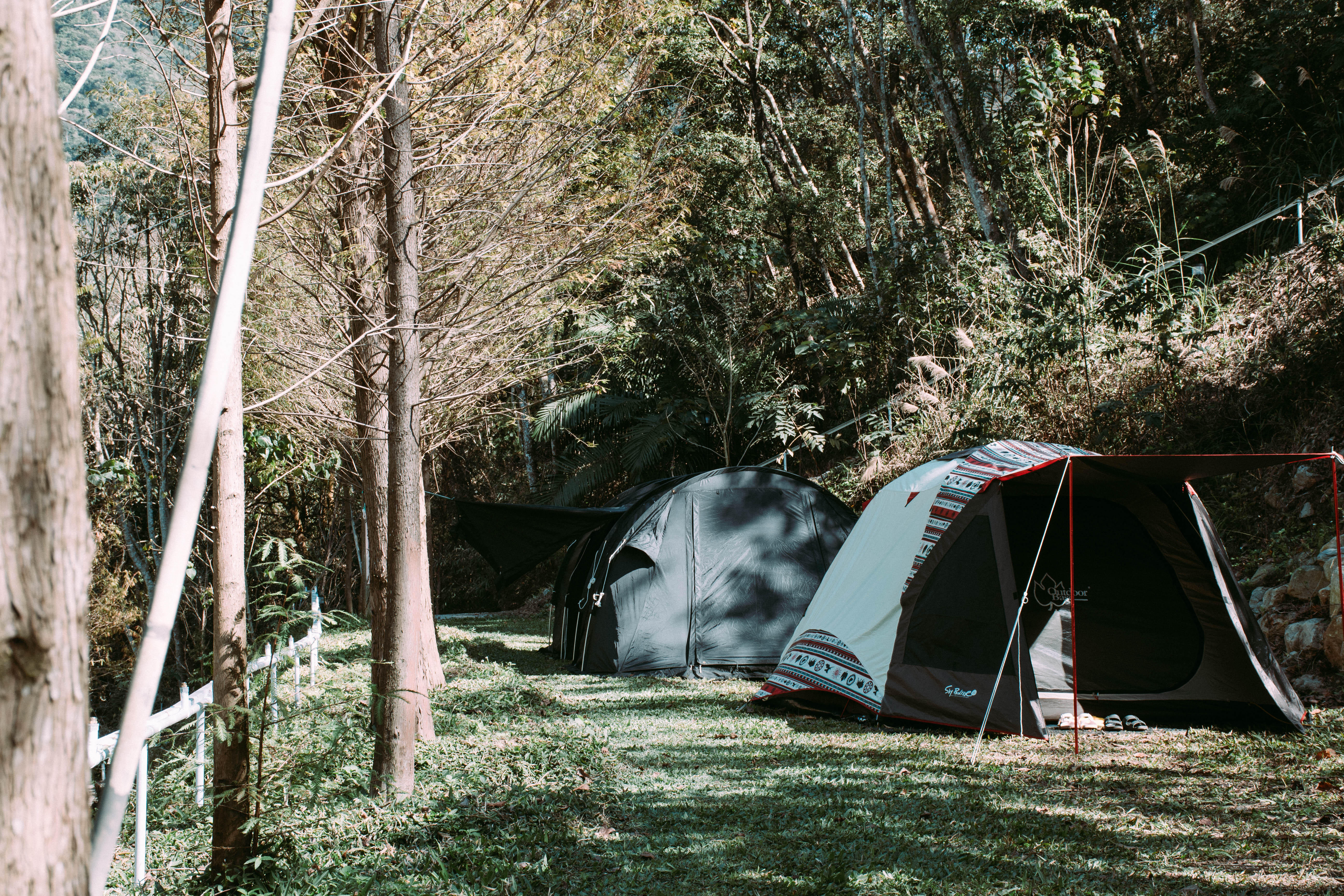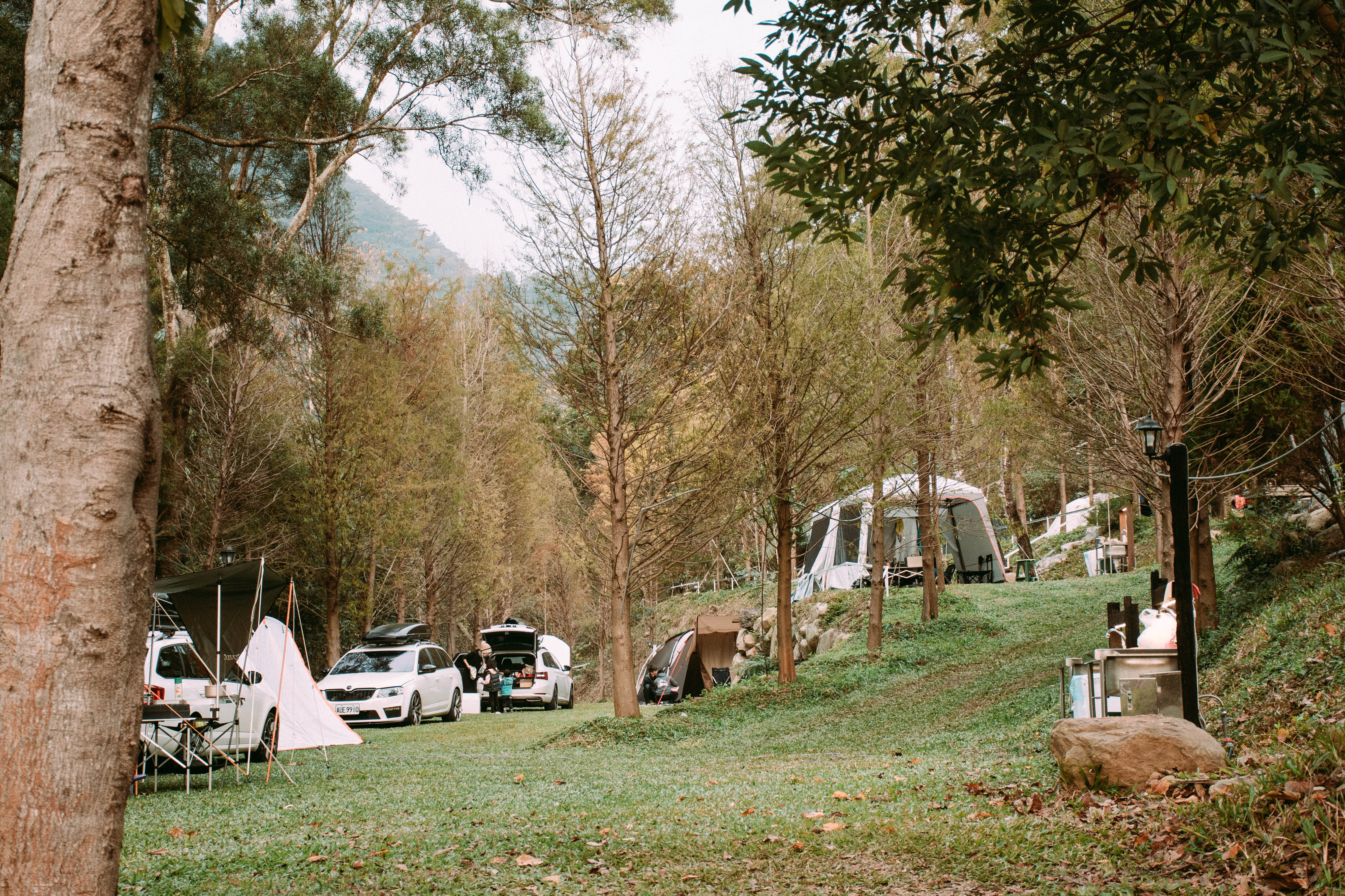 將帳篷落腳在整排落雨松樹旁